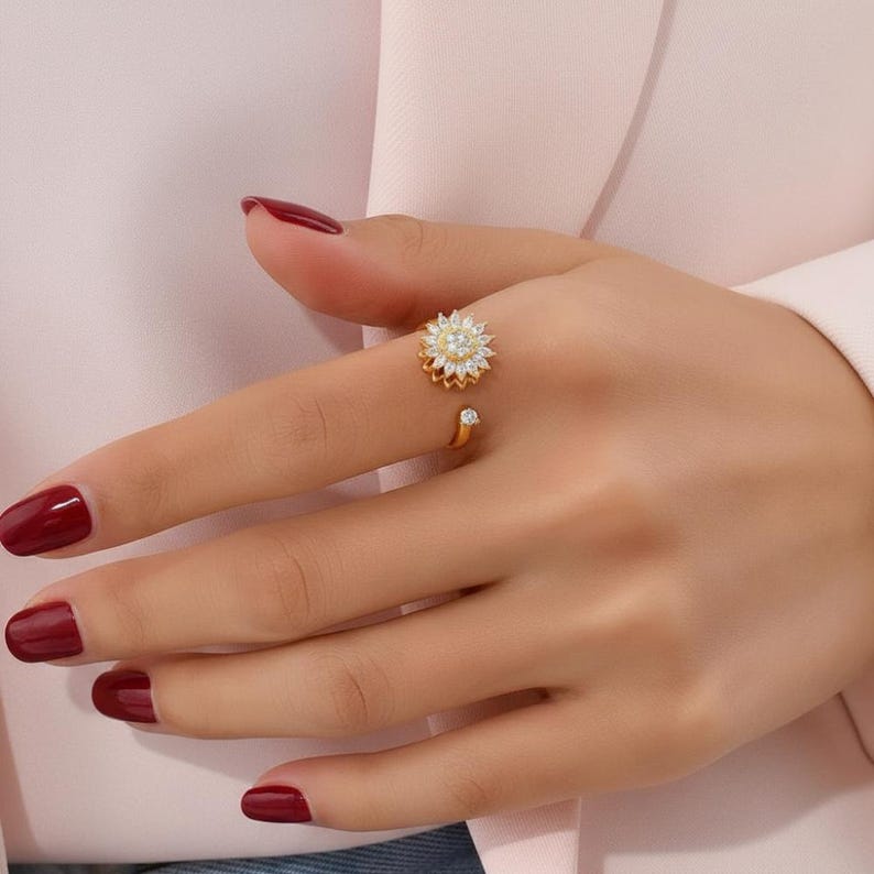 Der Hennie Blumen-Drehring vereint stilvolle Schönheit mit einer beruhigenden Funktion. Das filigrane Blumen-Design mit funkelnden Zirkonia-Steinen macht diesen Ring zu einem eleganten Hingucker – während das sanfte Drehelement hilft, Stress abzubauen und den Moment bewusster zu erleben.