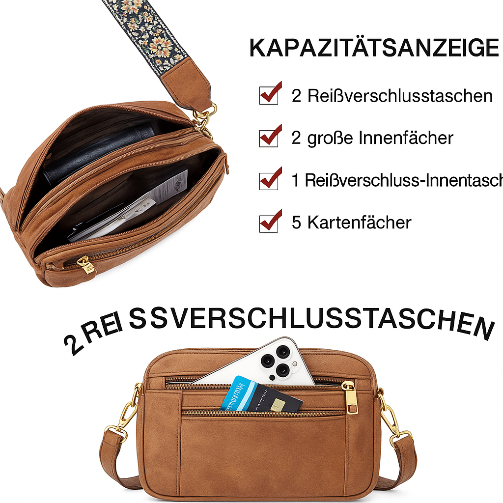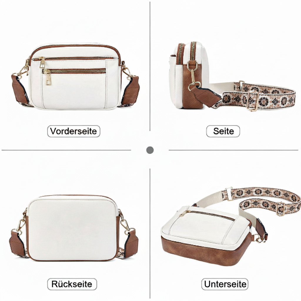Die Leder-Umhängetasche vereint Eleganz und Alltagstauglichkeit auf perfekte Weise. Mit großzügigem Stauraum und durchdachten Fächern behältst du jederzeit den Überblick. Aus hochwertigem Leder gefertigt, ist sie robust, weich im Griff und leicht zu pflegen. Der verstellbare Schulterriemen garantiert ganztägigen Komfort, während das elegante Design jedem Look einen Hauch von Raffinesse verleiht.